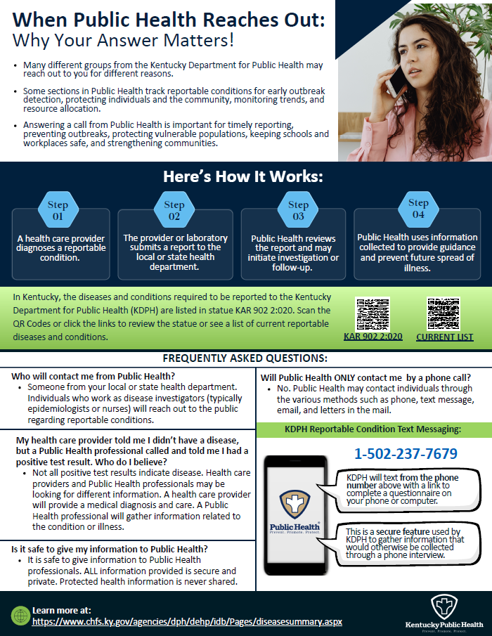 The KDPH Reportable Disease Section (RDS) has launched a new way for individuals to complete the questionnaire involved in the reportable disease investigation process. KDPH could contact you via phone, text message, email or by letter. However, they will now send the link to the investigation questionnaire from the following number: 1-502-237-7679. Please reach out if you have any questions!